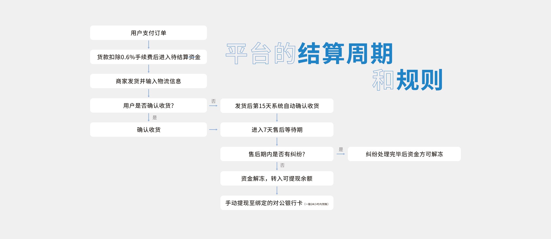 1. 结算核心概念:用户支付的货款,在扣除0.6%的交易手续费后,会进入“待结算资金”。这笔钱需要经过图中所列的流程,最终解冻后才会变成“可提现资金”。